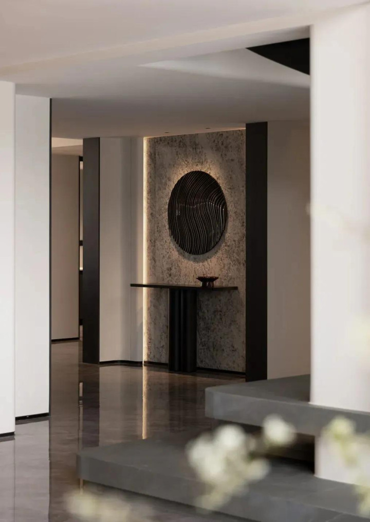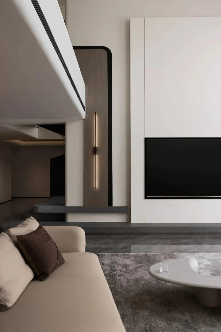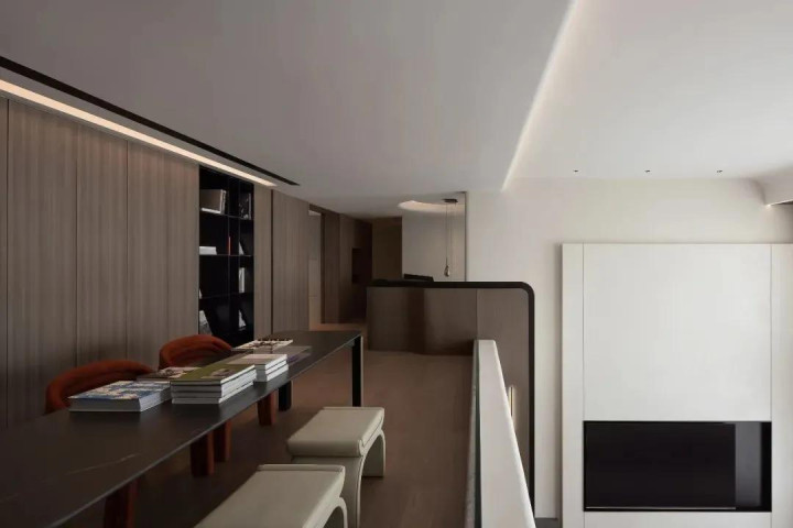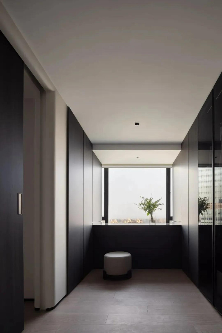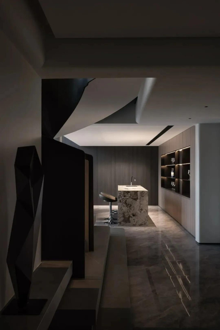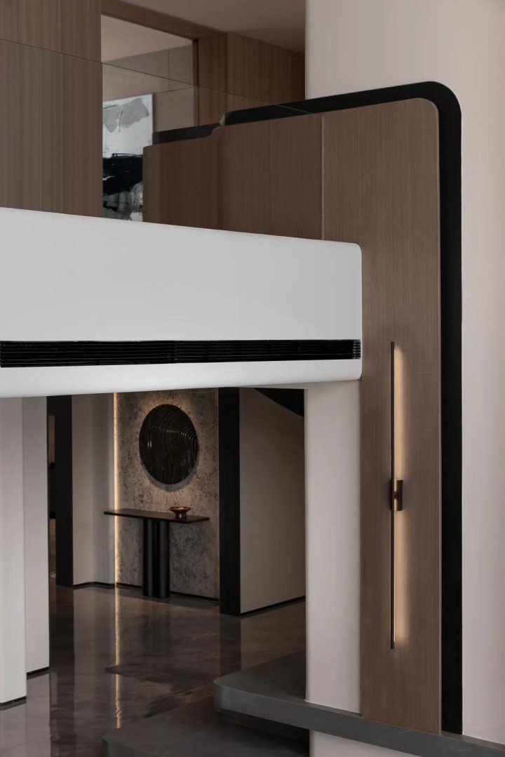 在某些过渡地带,风格化的装饰被抛在一边,转而全心投入对线面体的精雕细琢。几何的凌厉与极简的温婉相互交融、展现、绽放,悄悄消解了风格的桎梏,将家重新 “揽入” 一个只属于家之灵魂的范畴,沉稳且洋溢着自在的氛围。