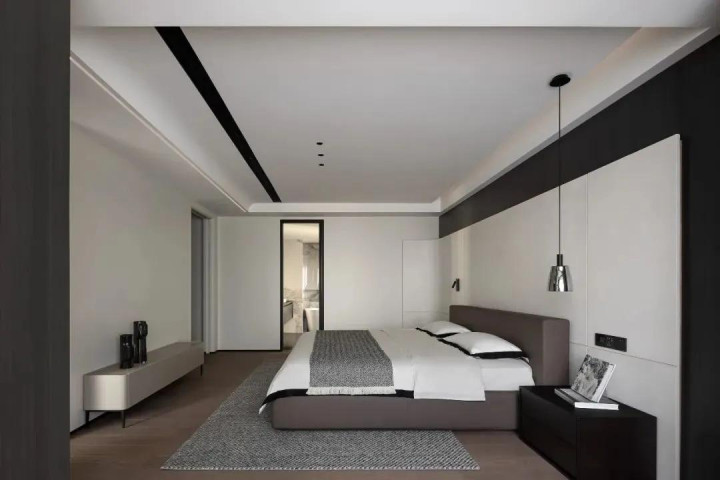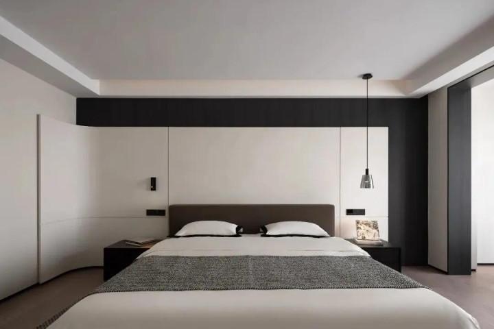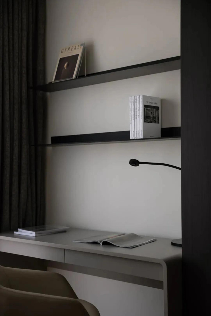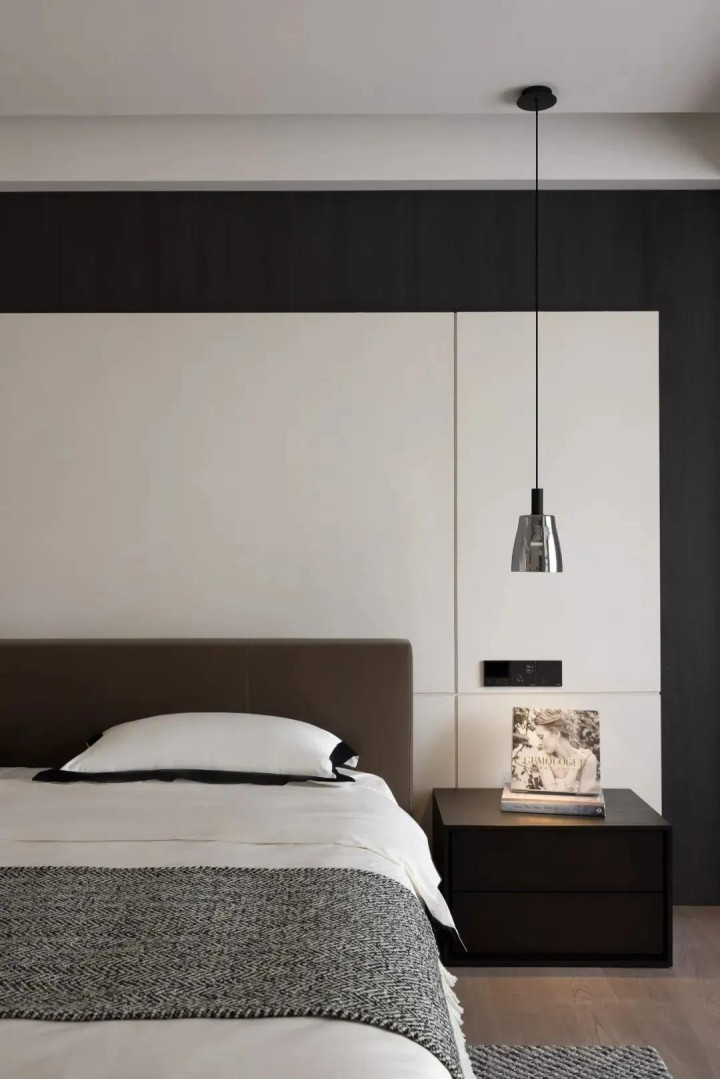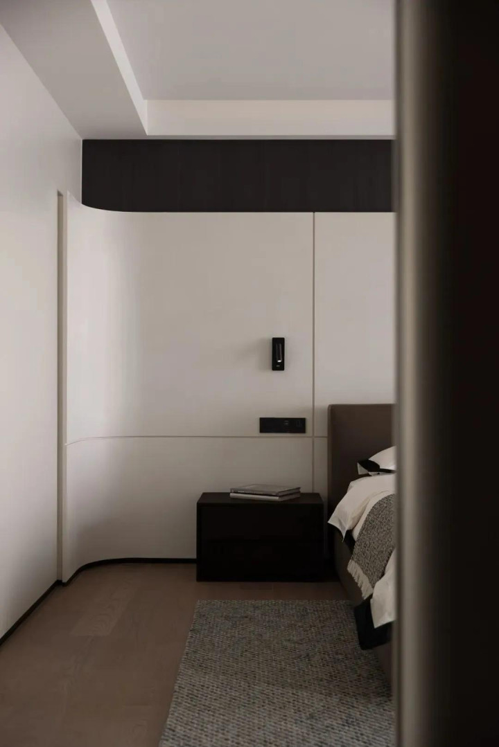 为守住日常的私密感,两侧窗户都悬着拉帘,居住者尽可自主拿捏视野的边界,以及空间对外展露的开放姿态。背景墙与床边几丝丝入扣地衔接,再度彰显线面体对功能与格局的极致演绎。这背后,设计师的奇思妙想与居住者的生活蓝图,在无数次碰撞中终成完美和声。